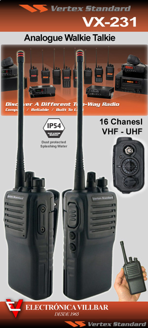 Diseño delgado, ligero y duradero, comunicaciones fáciles y seguras. El Vertex Standart VX-231 es un portátil analógico con 16 canales que proporciona un gran rendimiento, una gran duración y una excelente fiabilidad.
